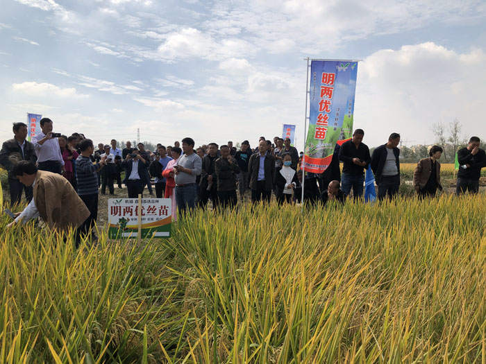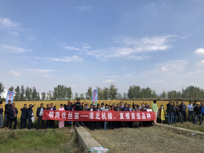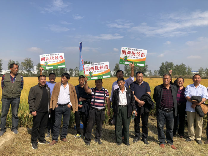 風吹楊柳盡,雨落稻花香。金秋十月,金黃的稻谷隨著秋風翻起金波,豐收在即。公司于10月8日-9日在江蘇省睢寧縣隆重召開明兩優(yōu)絲苗田間觀摩會議。參加會議有江蘇明天種業(yè)科技股份有限公司副總經(jīng)理王波、總經(jīng)理助理楊海波及公司代表,睢寧縣明兩優(yōu)絲苗核心代理商彭奔、各縣市經(jīng)銷商、種植大戶、育秧合作社代表共計100余人參加會議。
